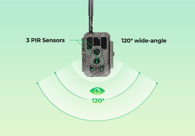 The GardePro X60PMB features 3 PIR sensors for enhanced detection, with a trigger speed of just 0.1 seconds. It covers a wide 120° detection angle and can detect motion up to 85ft (27m).