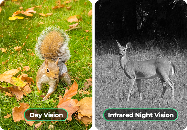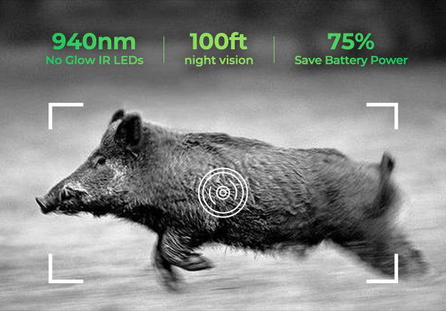 The camera uses 940nm No Glow IR LEDs and a Smart Night Vision Algorithm to deliver clear images up to 100ft (30m) away, even in complete darkness, without disturbing wildlife.