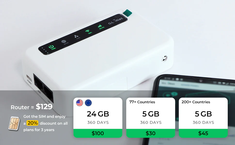 Preloaded with a 24GB, 360-day plan for Europe and America. Enjoy seamless connectivity with the GL Router, designed to support over 200 countries. If you need coverage outside Europe and America, simply recharge for global access. Perfect for frequent travelers and remote workers, this router ensures reliable, flexible internet wherever you go. Stay connected and worry-free with eiotclub’s top-notch global solution.